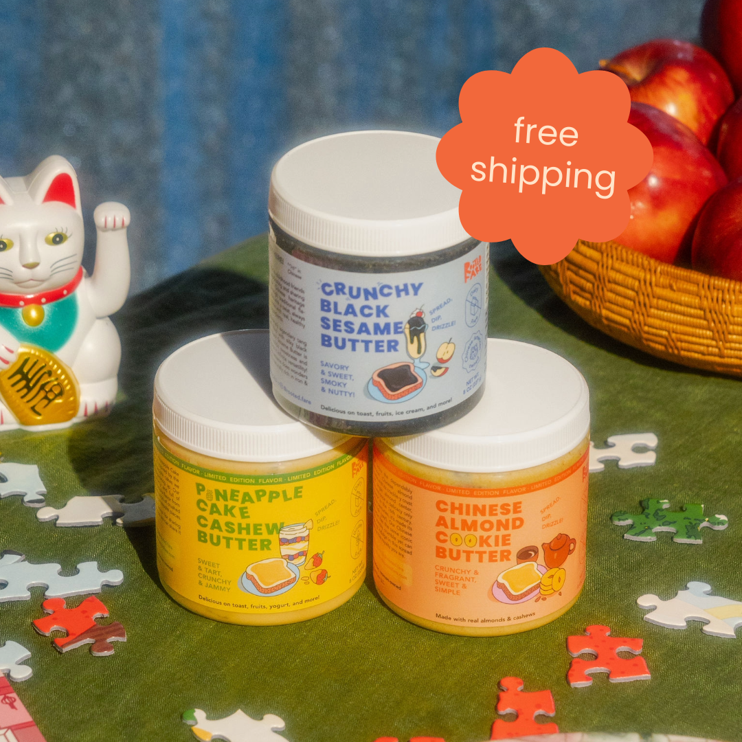 Our spreads offer the perfect blend of sweet, savory, and nutty tastes, inspired by classic Chinese desserts. Whether it’s our rich, crunchy Black Sesame Butter or our fragrant Chinese Almond Cookie Butter, each jar is a delicious way to add tradition with a modern twist to your meals. Great as gifts!