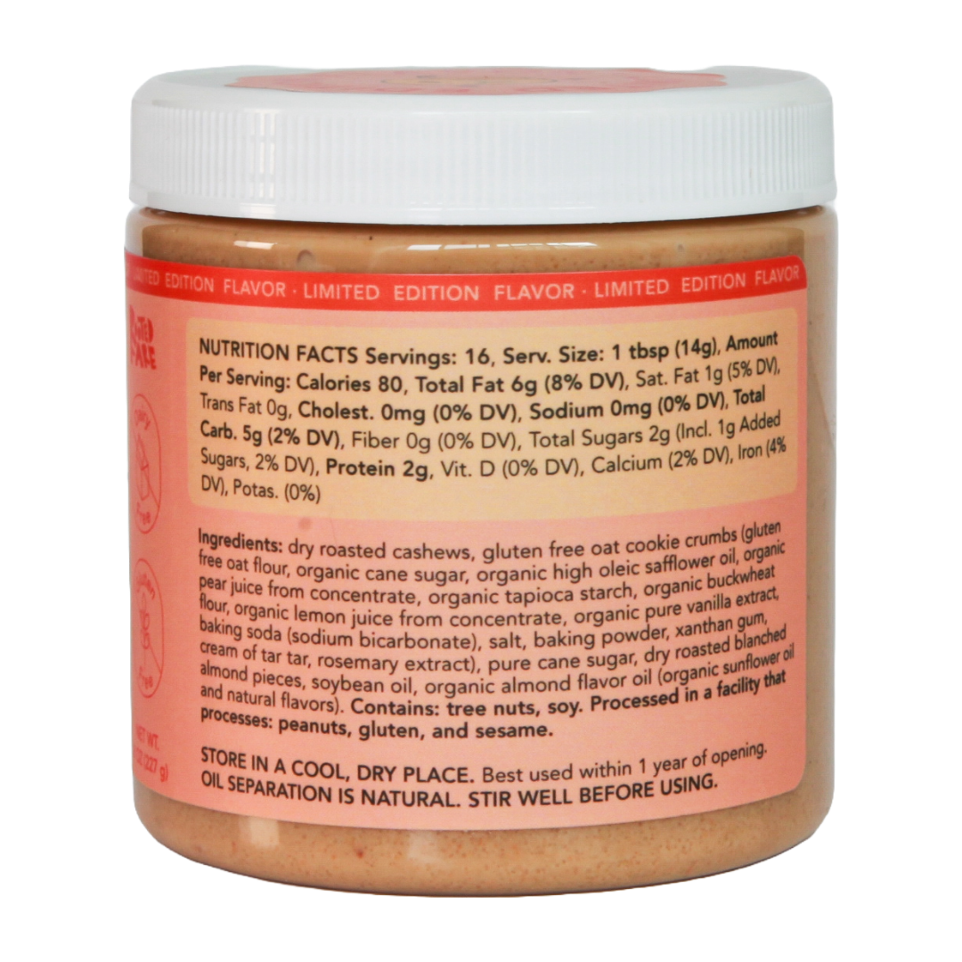 Dry roasted cashews, dry roasted blanched almonds, organic almond flavor oil (organic sunflower oil, natural flavors), gluten-free oat cookie crumbs (gluten-free whole oat flour, organic cane sugar, organic high oleic safflower oil, organic pear juice from concentrate, organic tapioca starch, organic buckwheat flour, organic lemon juice from concentrate, organic pure vanilla extract, baking soda, salt, baking powder, xanthan gum, cream of tartar, rosemary extract), salt, baking powder, xanthan gum (cream of tartar, rosemary extract), pure cane sugar.
