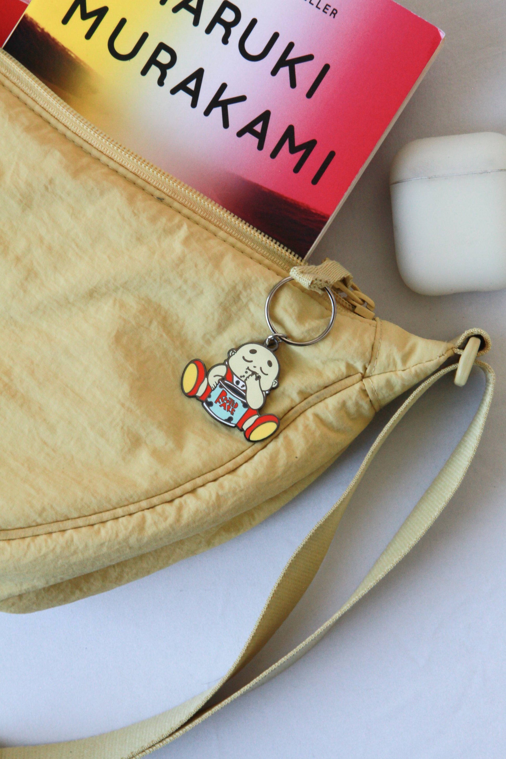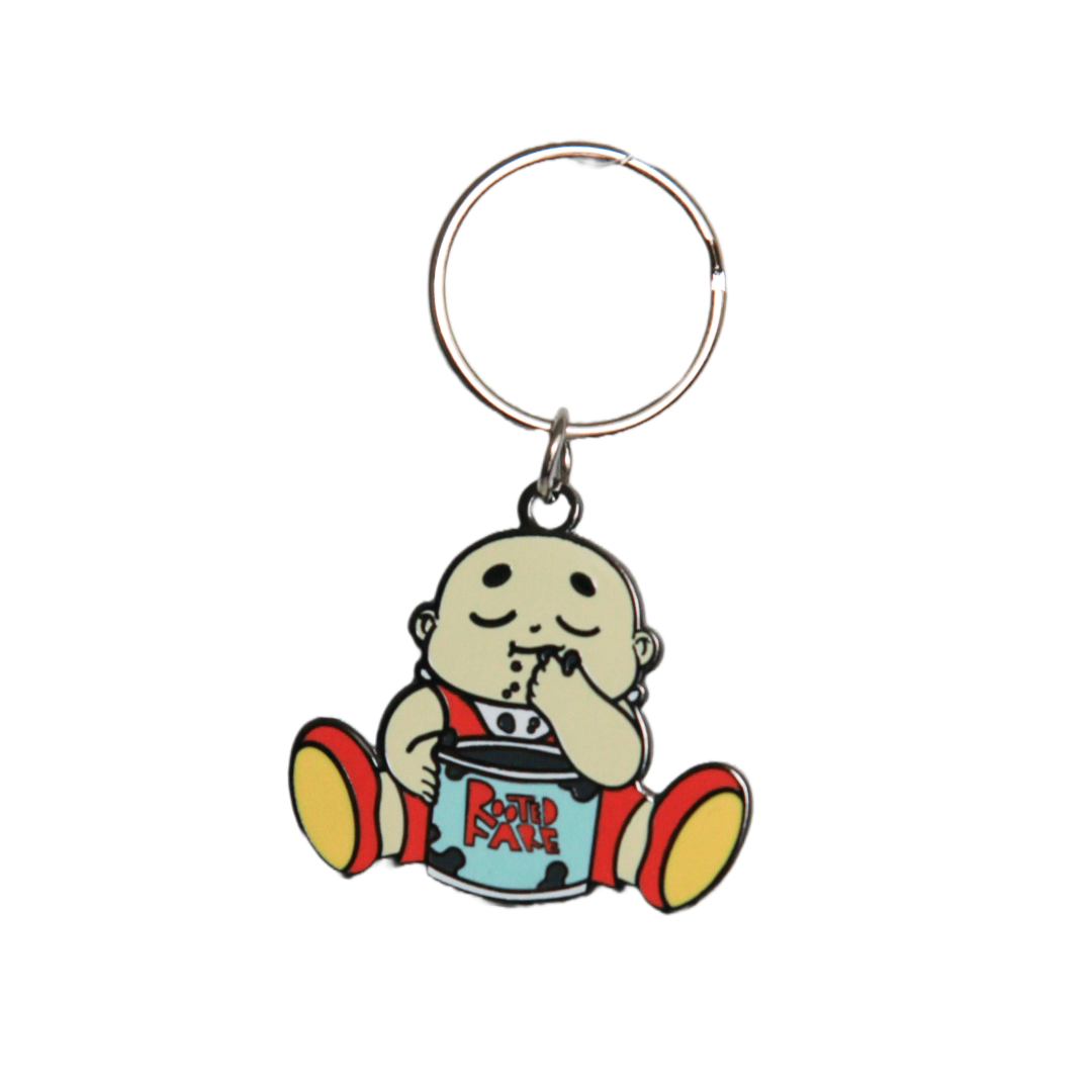 A cute 1" enamel keychain featuring Chunky Things's signature baby eating through a giant jar of Rooted Fare's Crunchy Black Sesame Butter. Match it with your keys or your favorite bag!