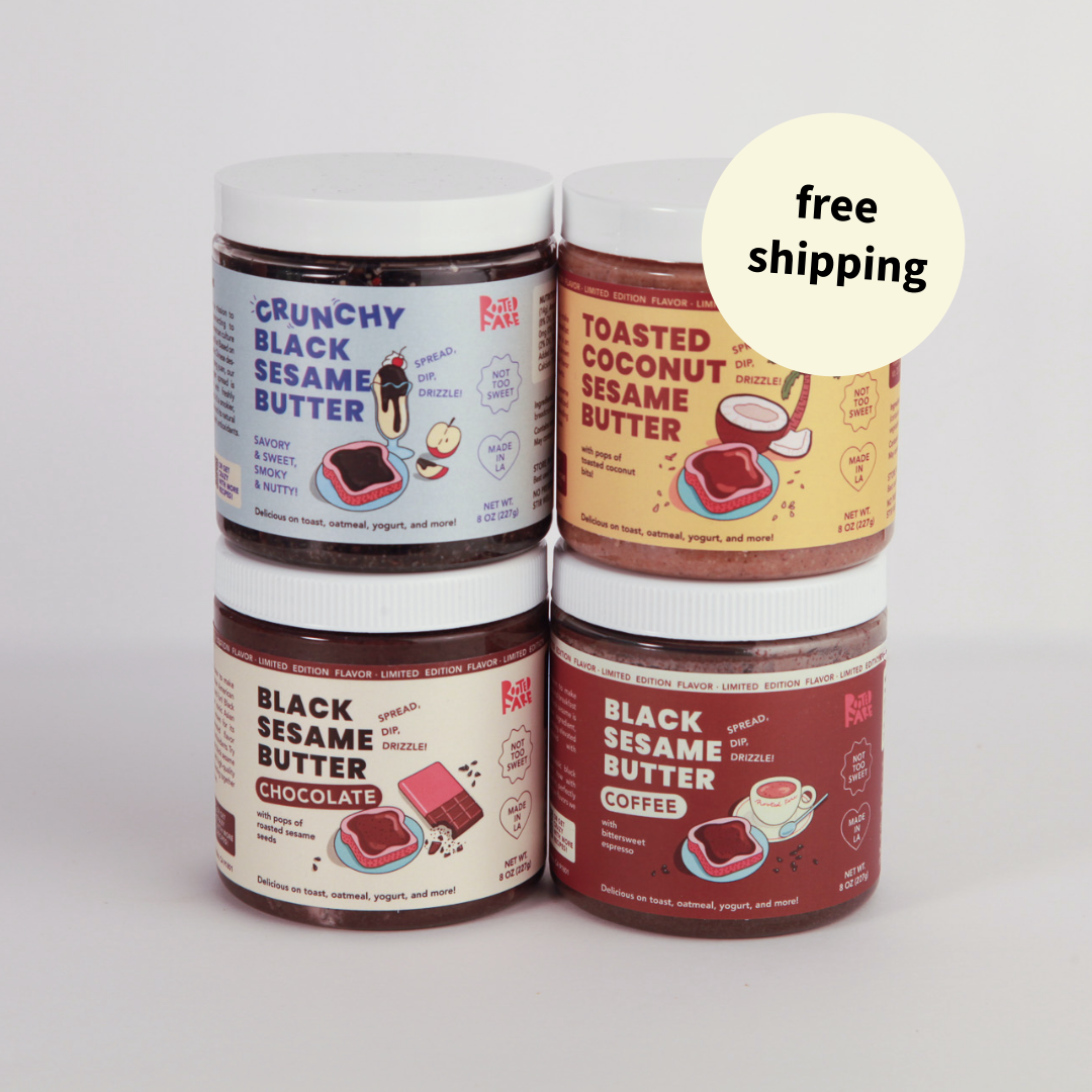 Save when you get all four flavors of delicious sesame spreads to add unbelievably delicious flavor and texture to everything: 1) 1x award-winning OG Crunchy Black Sesame Butter, 2) 1x limited-edition Black Sesame Butter Chocolate, 3) 1x limited-edition Black Sesame Butter Coffee, and 4) 1x limited-edition Toasted Coconut Sesame Butter.