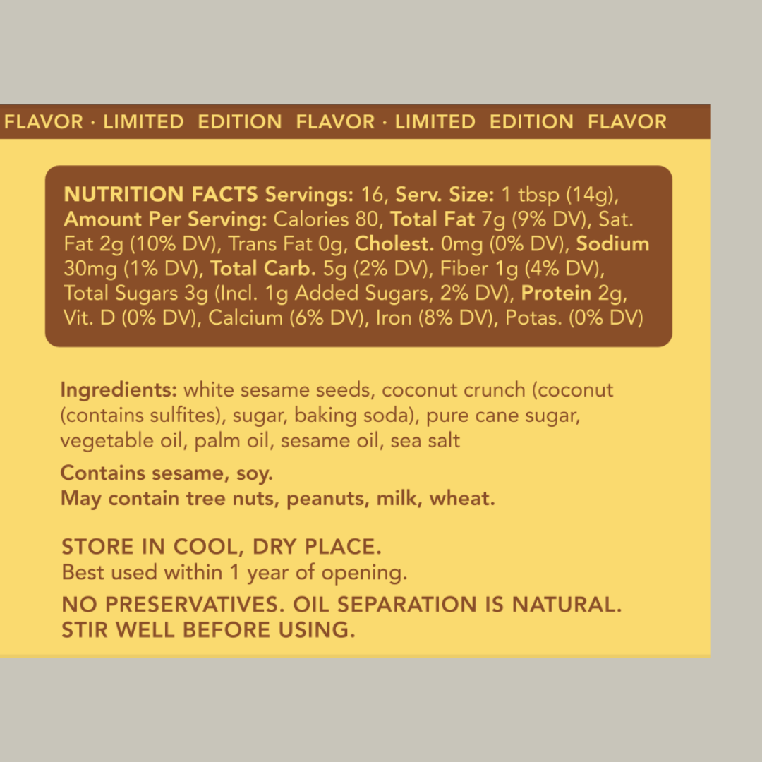 Ingredients: White sesame seeds, coconut crunch (coconut (contains sulfites), sugar, baking soda), pure cane sugar, vegetable oil, palm oil, sesame oil, sea salt.